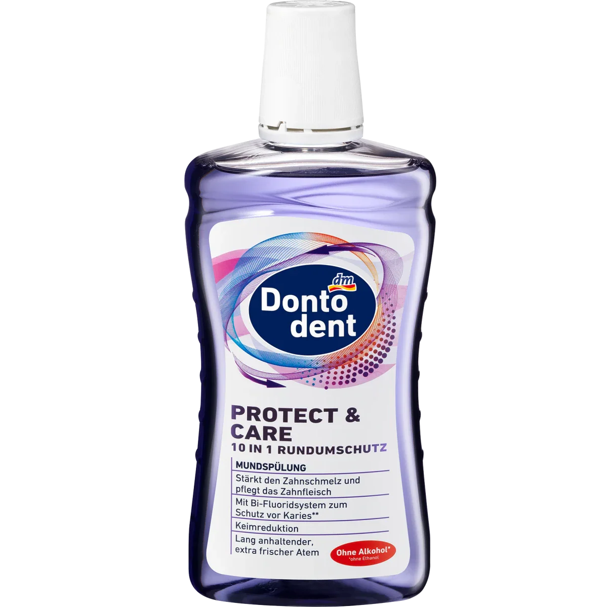 La solution buccodentaire Protect&Care 10 in 1 Dontodent sans alcool (sans éthanol) a été spécialement développée pour une hygiène complète dans toute la cavité buccale. Grâce à sa formule active 10 fois plus protectrice, elle procure une sensation de fraîcheur et de soin tout en nettoyant la cavité buccale même dans les endroits difficiles d’accès. **Contient du dihydrofluorure de bis(hydroxyéthyl)aminopropyl-N-hydroxyéthyloctadécylamine et du fluorure de sodium Teneur totale en fluorure : 450 ppm F