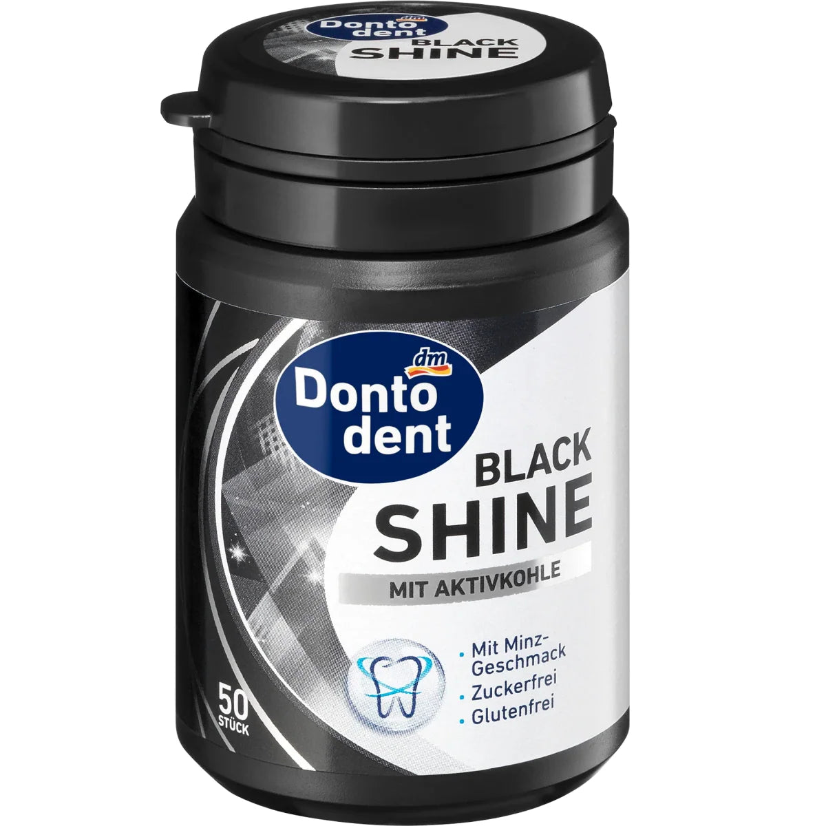 Pour un plaisir de mastication rafraîchissant : le chewing-gum Dontodent Black Shine est un produit de qualité suisse. Le chewing-gum au charbon actif, au xylitol, à l'huile de menthe et d'arbre à thé est sans gluten.