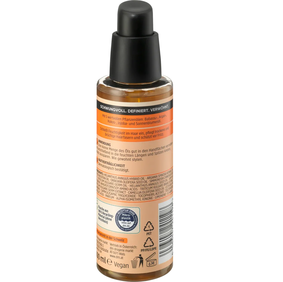 L'huile pour cheveux bouclés de rêve de Balea Professional se compose d'une formule performante pour un résultat perceptible et visible : des boucles naturellement vivantes, pleines de brillance et de ressort. La formulation agit grâce à 5 huiles végétales précieuses : huile de babassu, d'argan, de coco, de jojoba et de tournesol. Grâce à cette combinaison, l'huile capillaire soigne et définit les cheveux bouclés et leur confère une brillance naturelle ainsi que de la souplesse - avec un effet anti-frisottis.