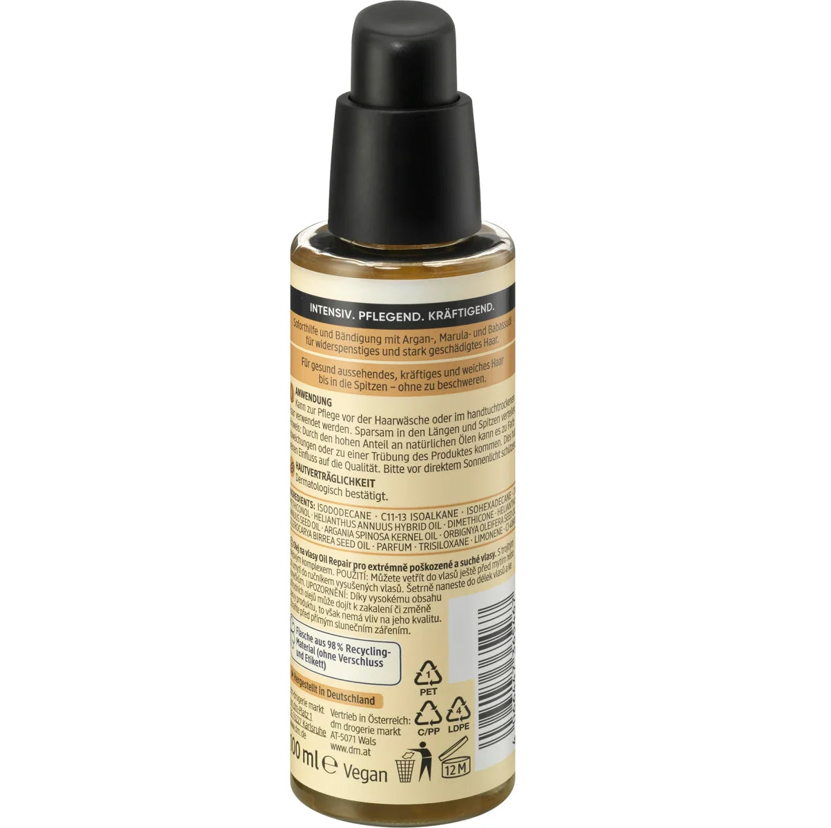 L'huile capillaire Oil Repair Intensiv de Balea soigne et protège vos cheveux de la chaleur jusqu'à 230°C. Ce soin capillaire intensif est un véritable miracle : sa formule ultralégère et non grasse à l'huile d'argan apporte un soin riche aux cheveux. De plus, elle aide à dompter les cheveux extrêmement abîmés, ainsi que les cheveux secs, et assure un résultat doux et souple - sans alourdir.
