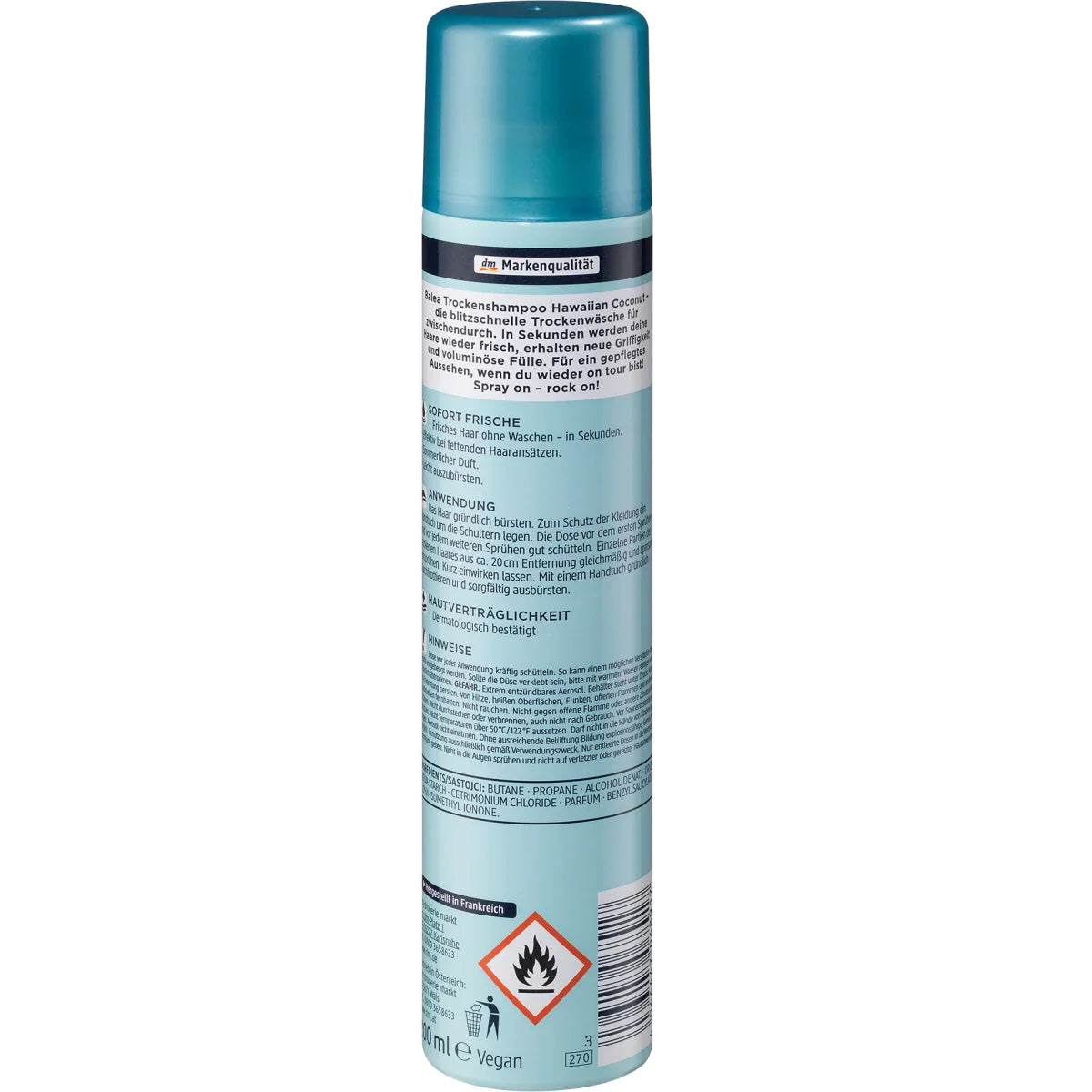 Le shampooing sec Hawaiian Coconut de Balea vous permet de faire un shampooing à sec en un clin d'œil entre deux utilisations. En quelques secondes, vos cheveux retrouvent leur fraîcheur, un nouveau toucher et du volume. Pour une apparence soignée à tout moment, même en déplacement et en cas de stress. Formule sans microplastique et sans polymères synthétiques solubles dans l'eau.