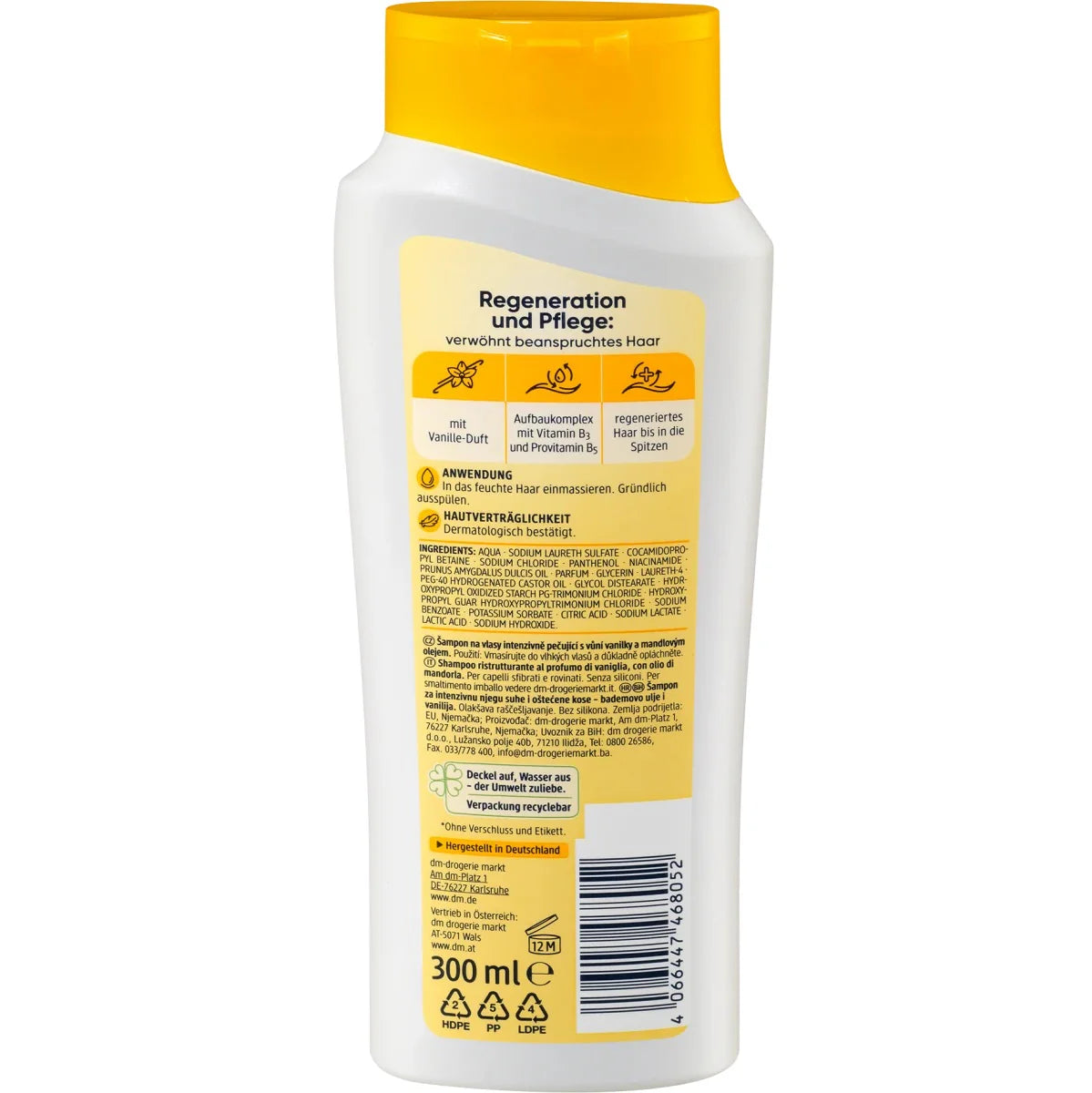 Régénération et soin : le shampooing soin intensif Balea chouchoute les cheveux abîmés, avec un parfum de vanille, un complexe reconstituant avec de la vitamine B3 et de la provitamine B5 - pour des cheveux régénérés jusqu'aux pointes. Testé sous contrôle dermatologique. Formule sans microplastiques et sans polymères synthétiques solubles dans l'eau.